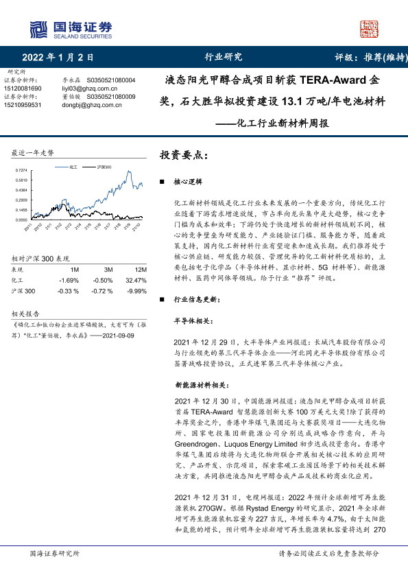 【国海证券】【20220102】20220102-国海证券-化工行业新材料周报:液态阳光甲醇合成项目斩获TERA-Award金奖,石大胜华拟投资建设13.1万吨/年电池材料-37页