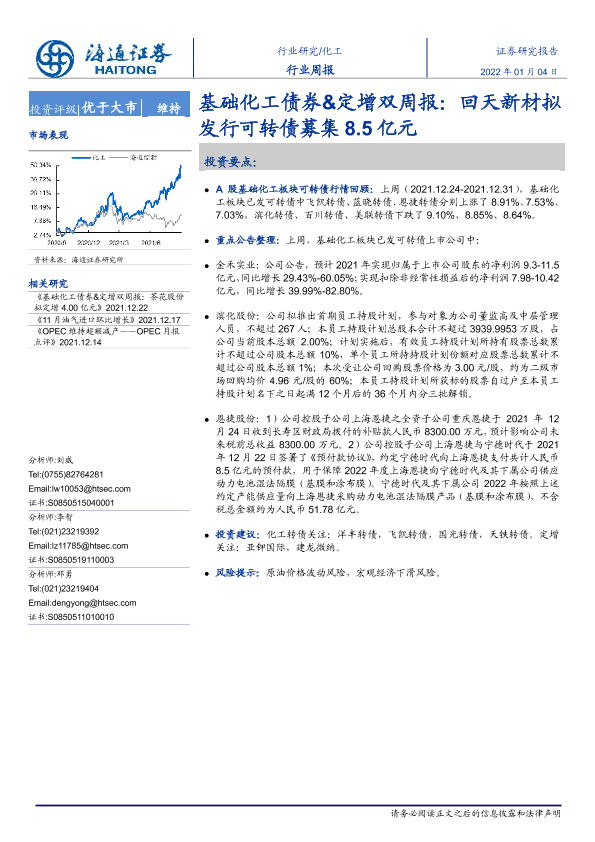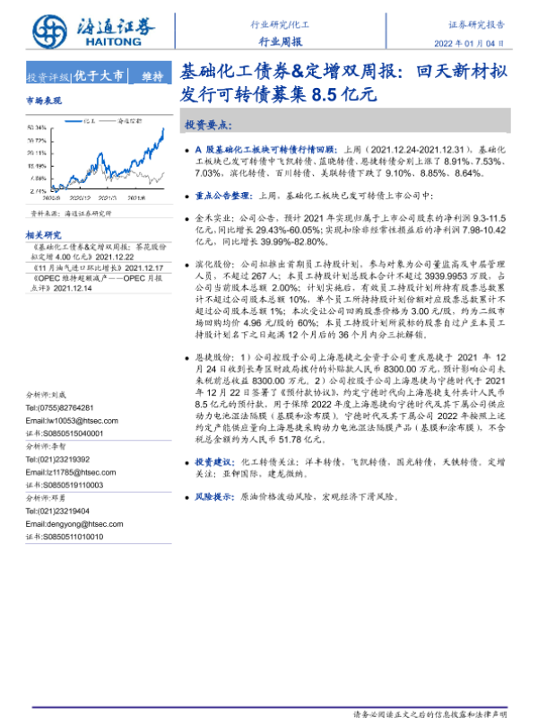 【海通证券】【20220104】基础化工债券&定增双周报:回天新材拟发行可转债募集8.5亿元-15页