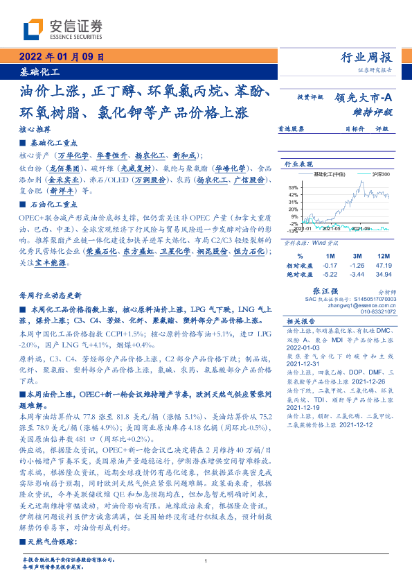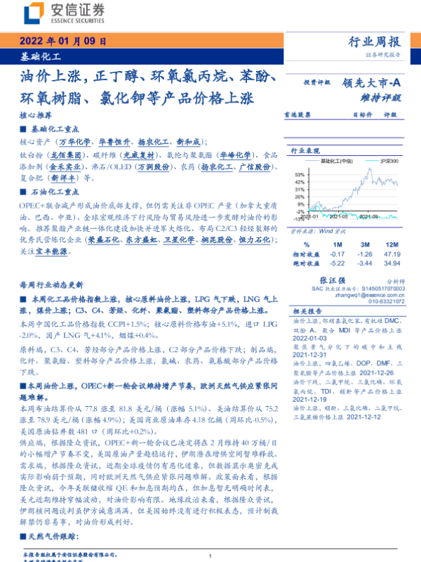 【安信证券】【20220109】基础化工:油价上涨,正丁醇、环氧氯丙烷、苯酚、环氧树脂、氯化钾等产品价格上涨-5页