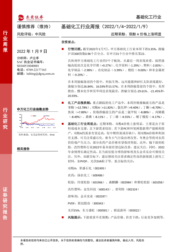 【东莞证券】【20220109】基础化工行业周报:近期苯酚、双酚A价格上涨明显-10页