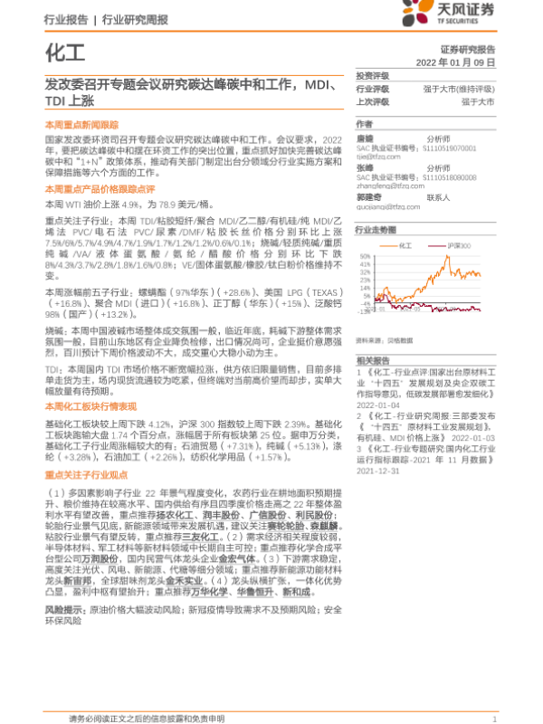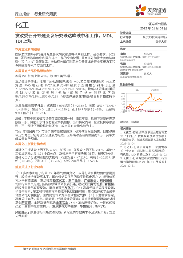 【天风证券】【20220109】20220109-天风证券-化工行业研究周报:发改委召开专题会议研究碳达峰碳中和工作,MDI、TDI上涨-20页