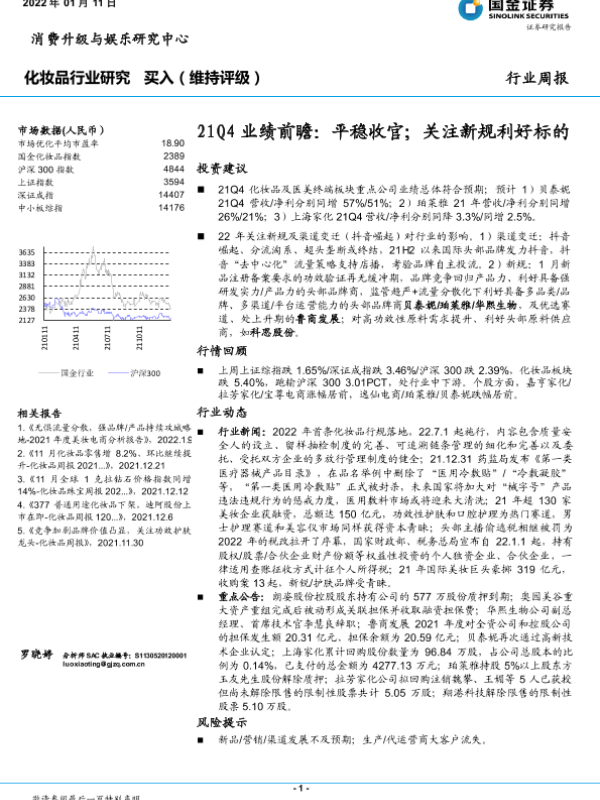 【国金证券】【20220111】20220111-国金证券-化妆品行业研究:21Q4业绩前瞻:平稳收官;关注新规利好标的-10页