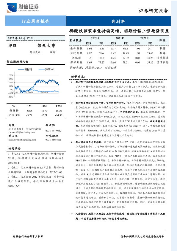 【财信证券】【20220117】20220117-财信证券-新材料行业周度报告:磷酸铁锂装车量持续高增,短期价格上涨趋势明显-15页
