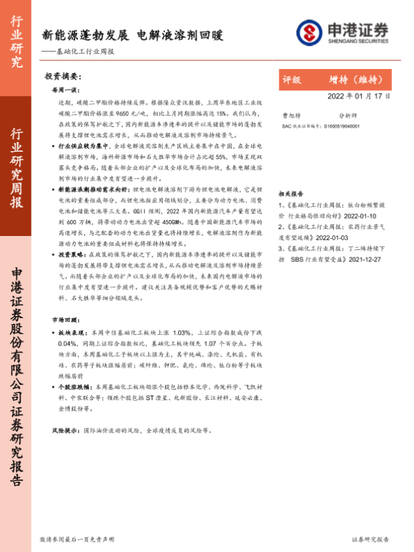 【申港证券】【20220117】基础化工行业周报:新能源蓬勃发展 电解液溶剂回暖-11页