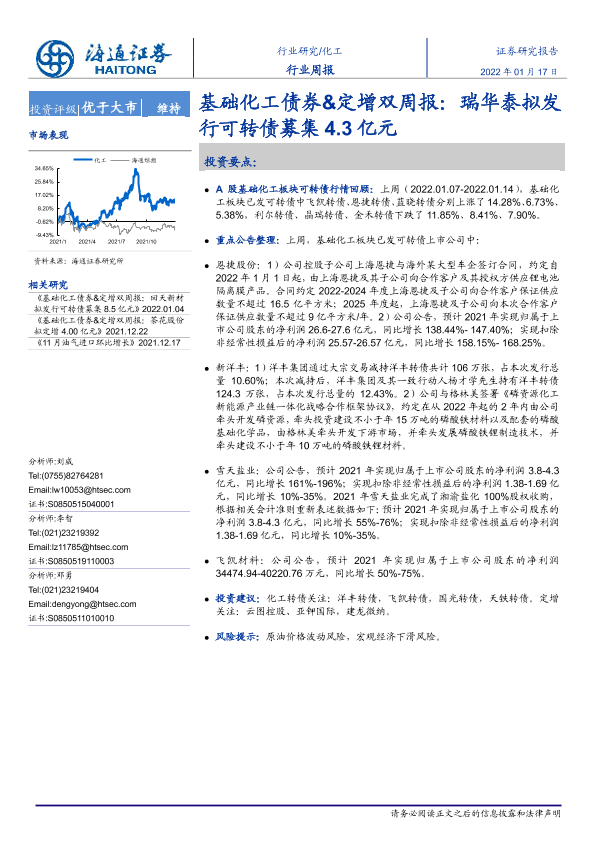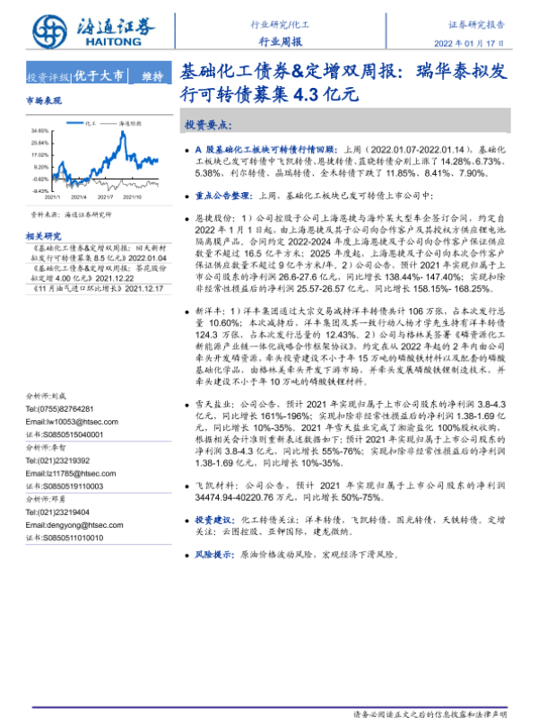 【海通证券】【20220117】基础化工债券&定增双周报:瑞华泰拟发行可转债募集4.3亿元-15页