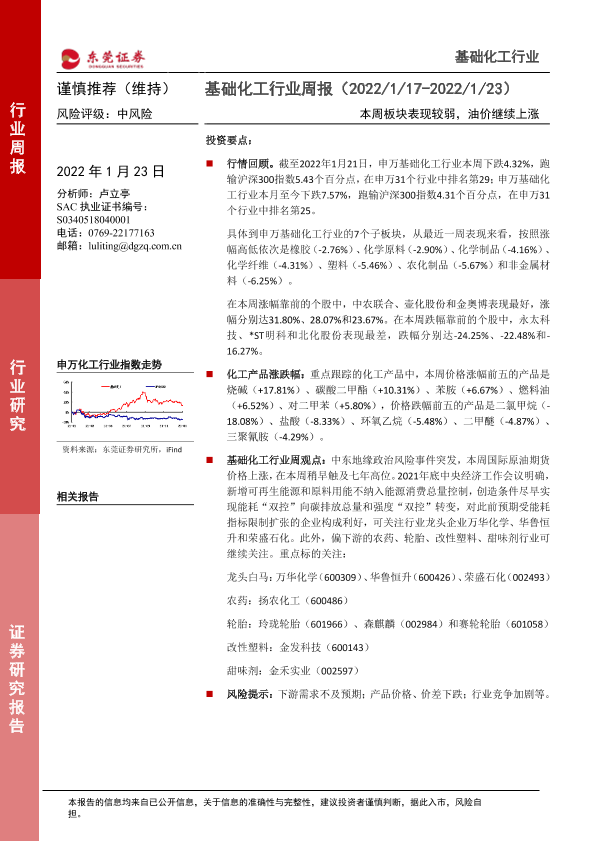 【东莞证券】【20220123】20220123-东莞证券-基础化工行业周报:本周板块表现较弱,油价继续上涨-10页