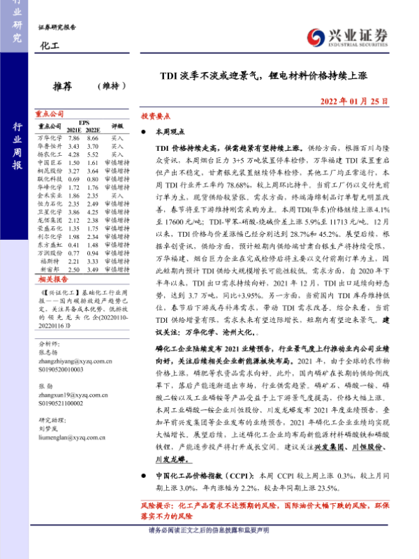 【兴业证券】【20220125】20220125-兴业证券-化工行业周报:TDI淡季不淡或迎景气,锂电材料价格持续上涨-51页