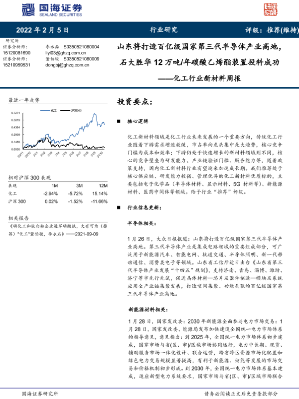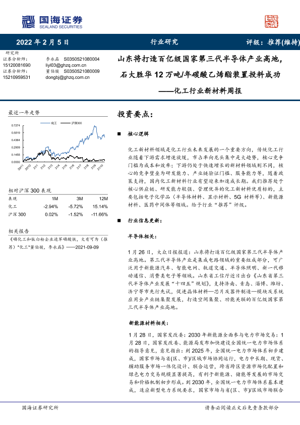 【国海证券】【20220205】20220205-国海证券-化工行业新材料周报:山东将打造百亿级国家第三代半导体产业高地,石大胜华12万吨 年碳酸乙烯酯装置投料成功-41页