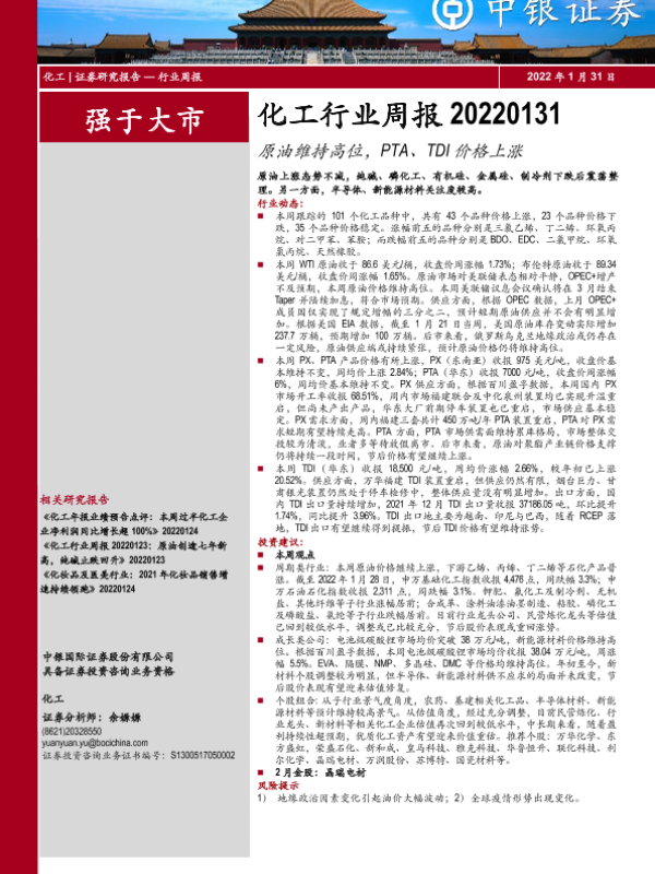 【中银证券】【20220131】20220131-中银证券-化工行业周报:原油维持高位,PTA、TDI价格上涨-16页