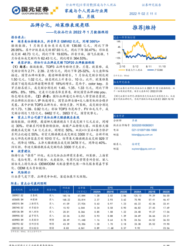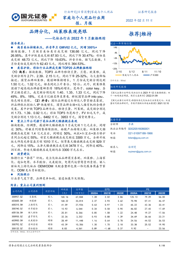 【国元证券】【20220211】品牌分化,珀莱雅表现亮眼——化妆品行业2022年1月数据跟踪-11页