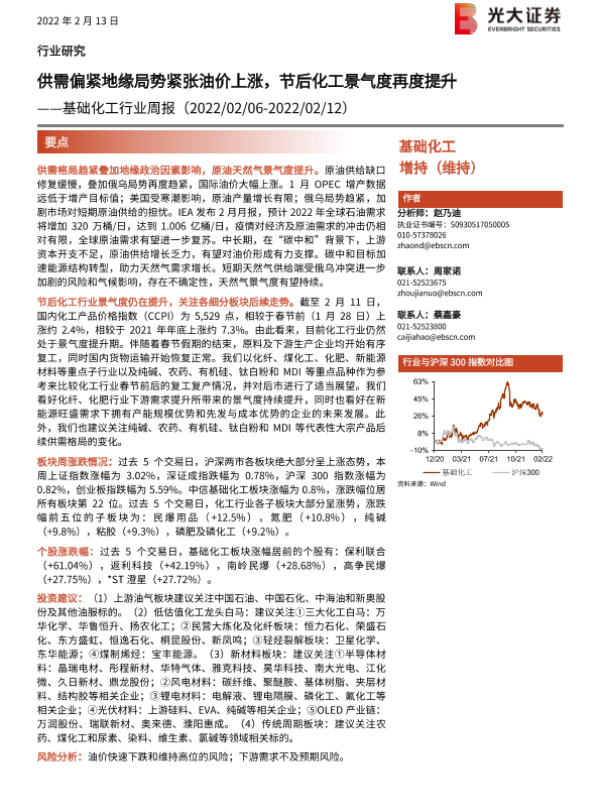 【光大证券】【20220213】20220213-光大证券-基础化工行业周报:供需偏紧地缘局势紧张油价上涨,节后化工景气度再度提升-32页