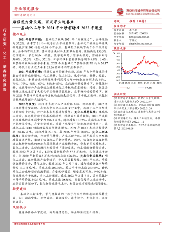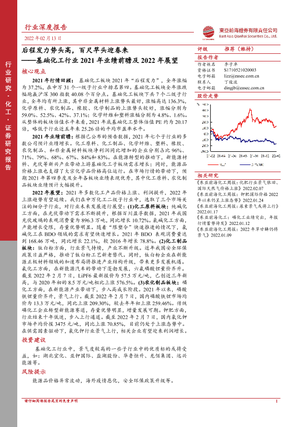 【东亚前海证券】【20220213】基础化工行业2021年业绩前瞻及2022年展望:后程发力势头高,百尺竿头迎春来-40页