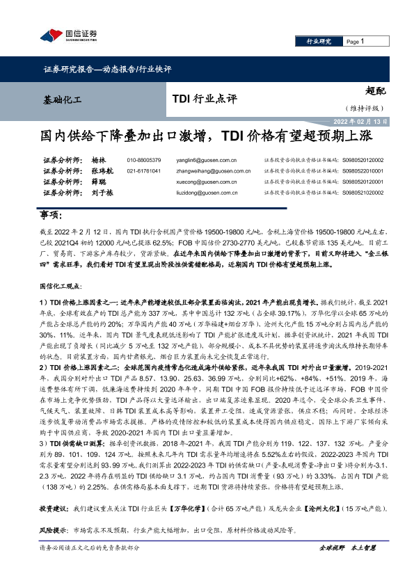 【国信证券】【20220213】基础化工TDI行业点评:国内供给下降叠加出口激增,TDI价格有望超预期上涨-10页