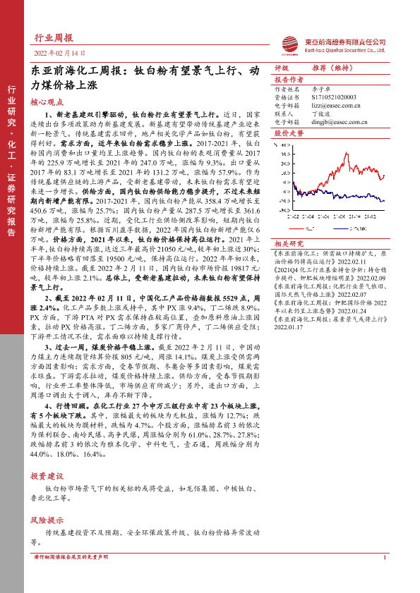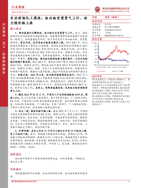 【东亚前海证券】【20220214】东亚前海化工周报:钛白粉有望景气上行、动力煤价格上涨-21页