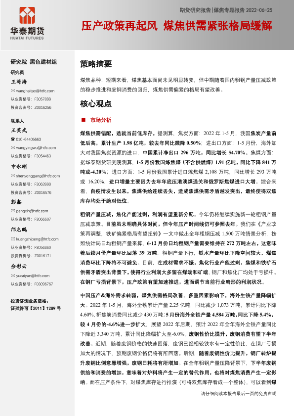 【华泰期货】【20220625】煤焦专题报告:压产政策再起风,煤焦供需紧张格局缓解-19页