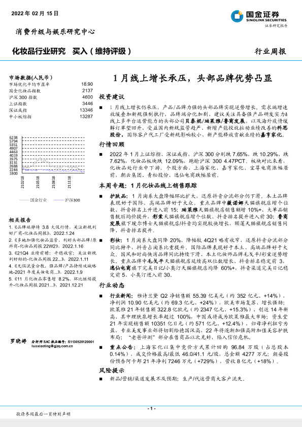 【国金证券】【20220215】20220215-国金证券-化妆品行业研究:1月线上增长承压,头部品牌优势凸显-32页