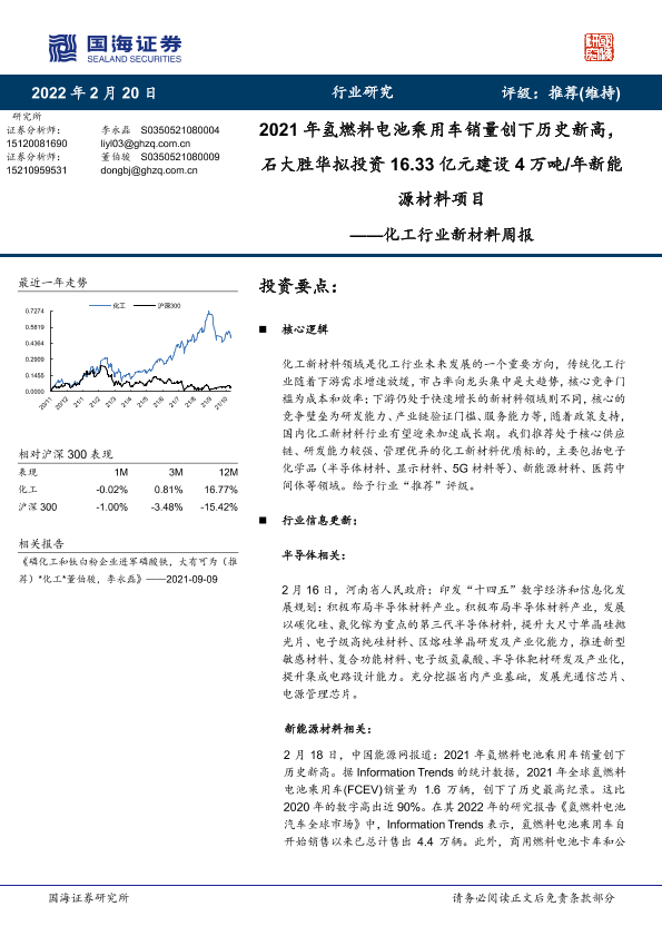 【国海证券】【20220220】20220220-国海证券-化工行业新材料周报:2021年氢燃料电池乘用车销量创下历史新高,石大胜华拟投资16.33亿元建设4万吨/年新能源材料项目-41页