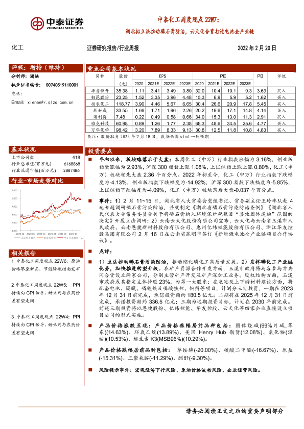 【中泰证券】【20220220】中泰化工周度观点22W7:湖北拟立法推动磷石膏防治,云天化合资打造电池全产业链-23页