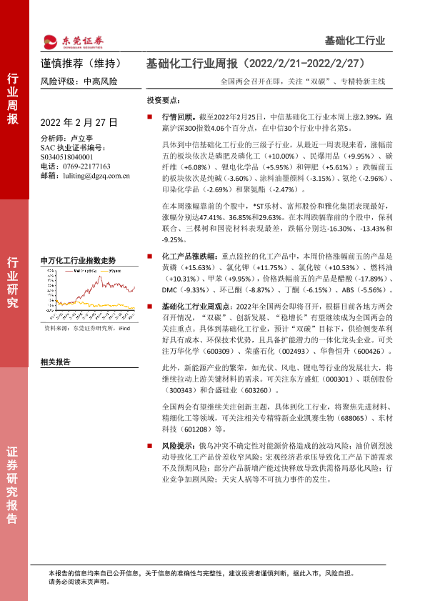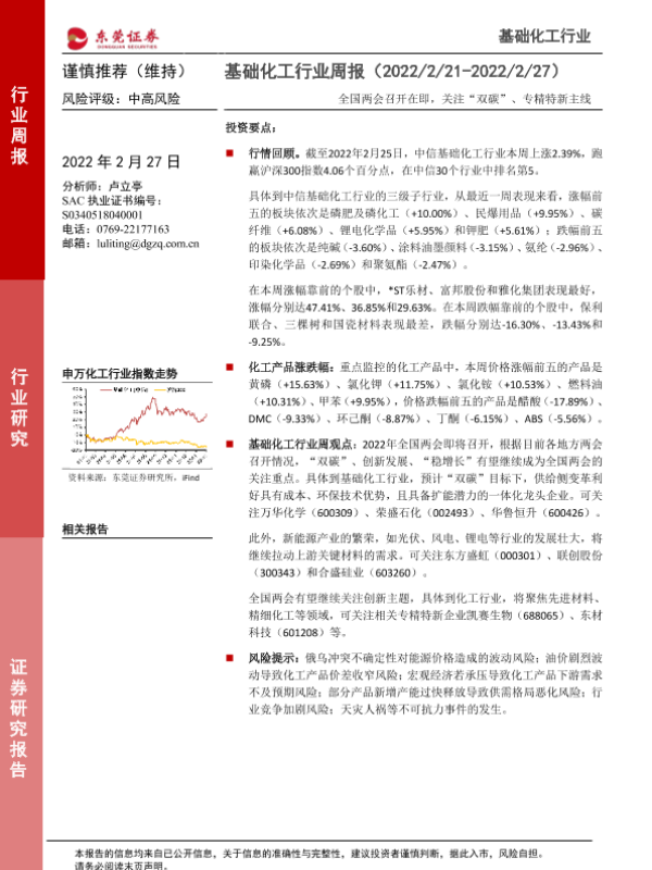 【东莞证券】【20220227】20220227-东莞证券-基础化工行业周报:全国两会召开在即,关注“双碳”、专精特新主线-11页