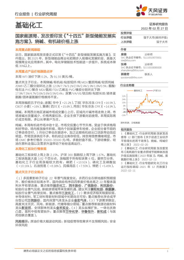 【天风证券】【20220227】基础化工行业研究周报:国家能源局、发改委印发《“十四五”新型储能发展实施方案》,烧碱、有机硅价格上涨-19页