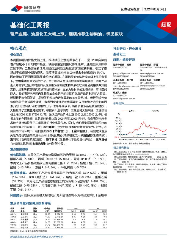 【国信证券】【20220304】20220304-国信证券-基础化工周报:硅产业链、油脂化工大幅上涨,继续推荐生物柴油、钾肥板块-18页