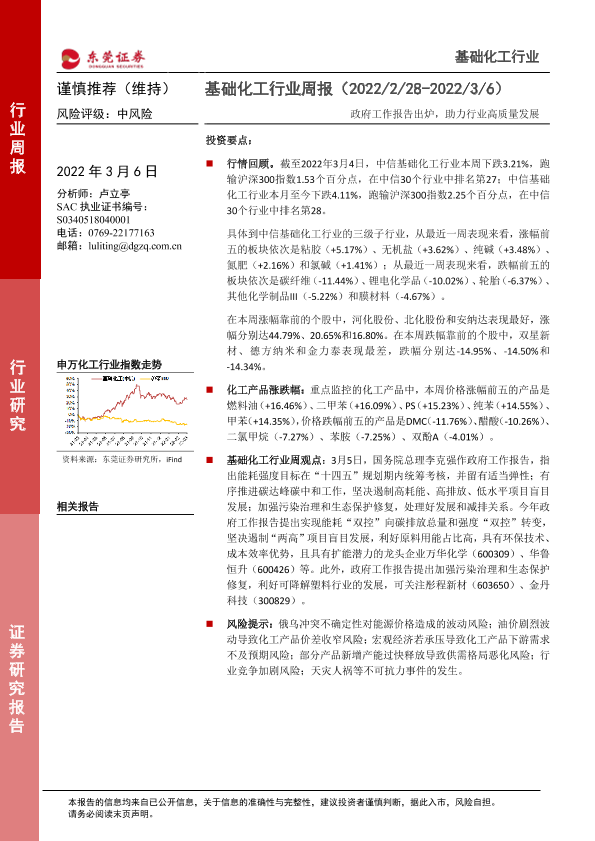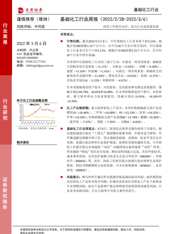 【东莞证券】【20220306】20220306-东莞证券-基础化工行业周报:政府工作报告出炉,助力行业高质量发展-12页