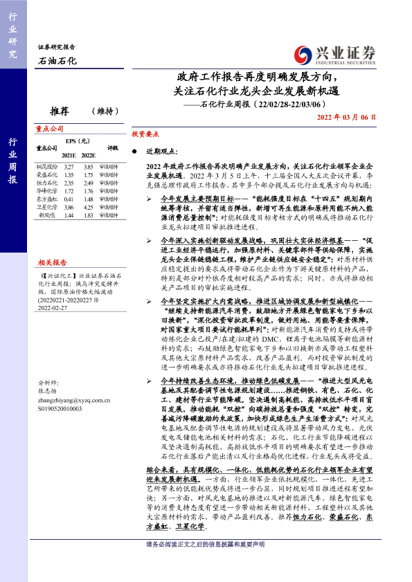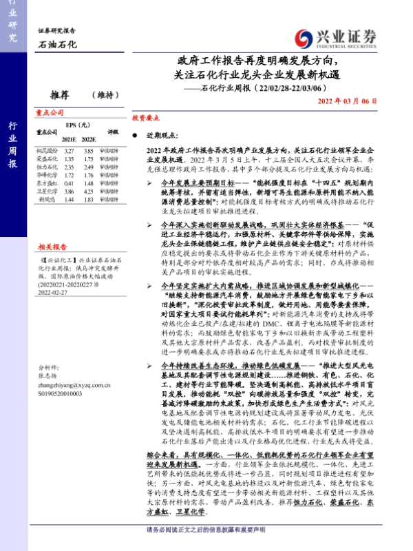 【兴业证券】【20220306】20220306-兴业证券-石化行业周报:政府工作报告再度明确发展方向,关注石化行业龙头企业发展新机遇-16页