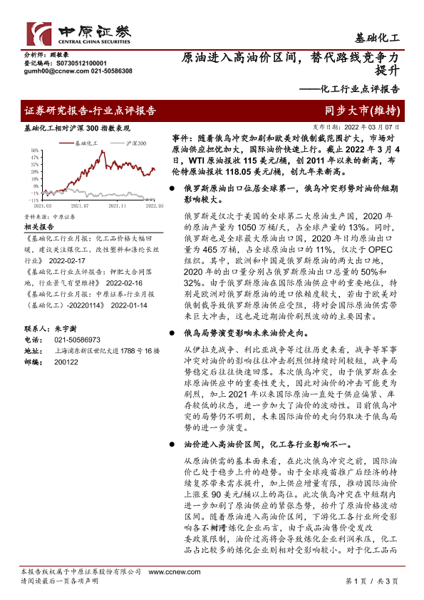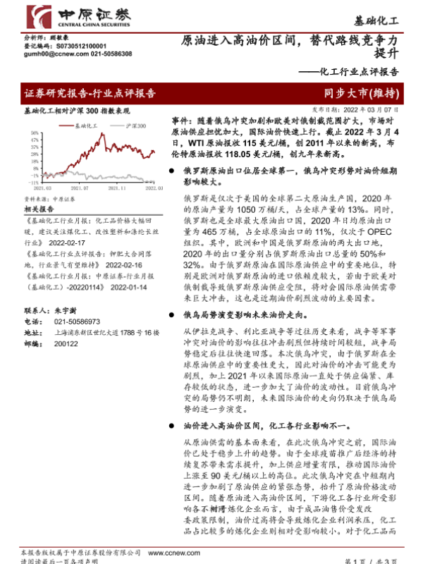 【中原证券】【20220307】化工行业点评报告:原油进入高油价区间,替代路线竞争力提升-3页