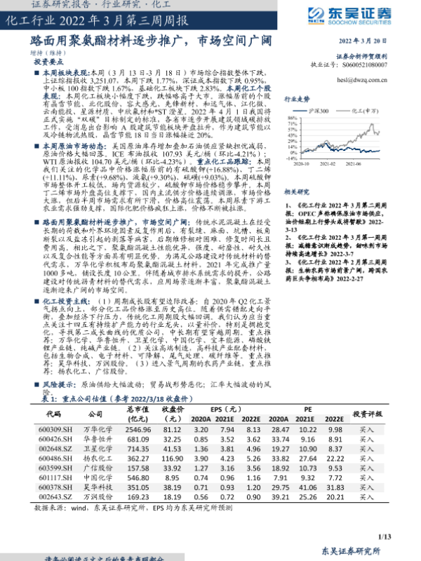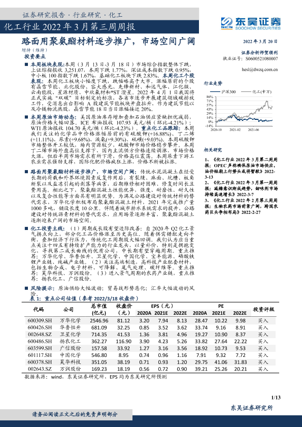 【东吴证券】【20220320】化工行业2022年3月第三周周报:路面用聚氨酯材料逐步推广,市场空间广阔-13页