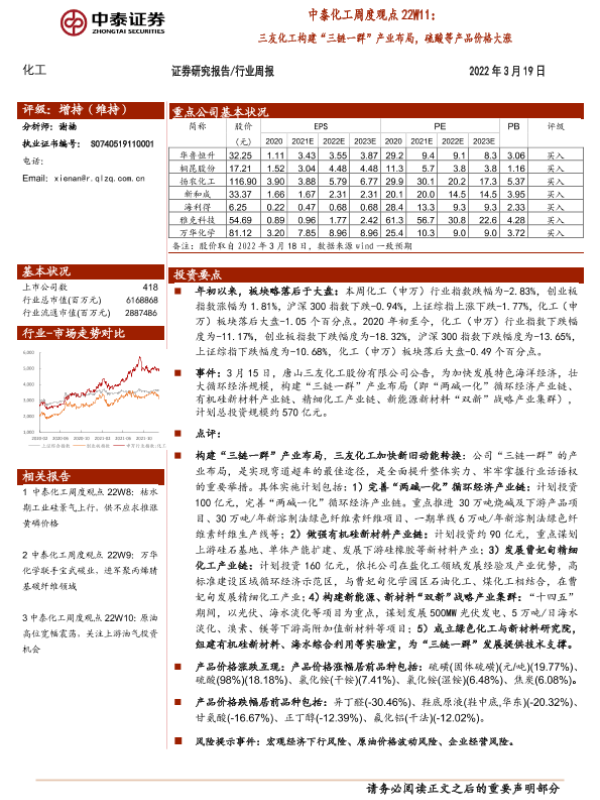 【中泰证券】【20220319】中泰化工周度观点22W11:三友化工构建“三链一群”产业布局,硫酸等产品价格大涨-23页