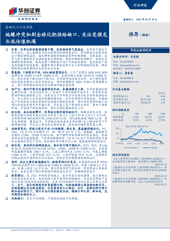 【华创证券】【20220320】基础化工行业周报:地缘冲突加剧全球化肥供给缺口,关注受损龙头低估值机遇-24页