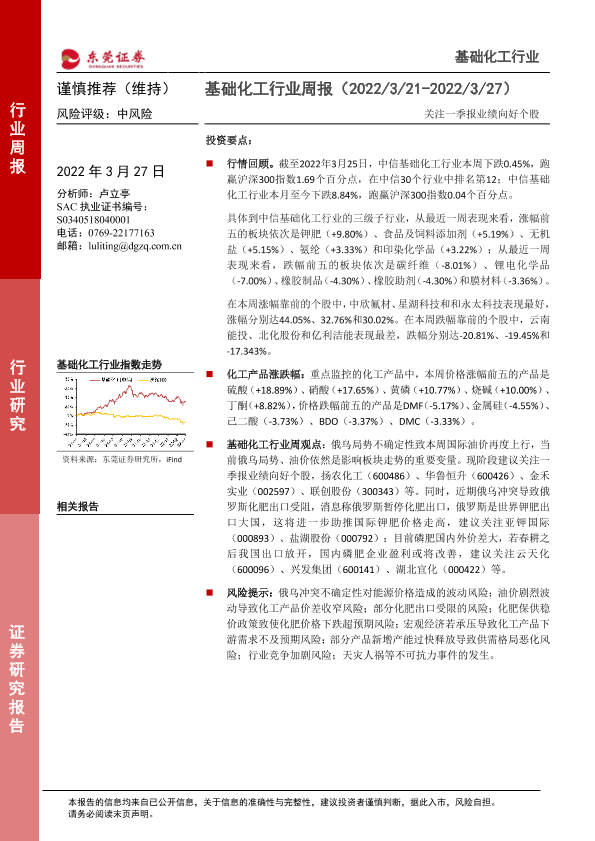 【东莞证券】【20220327】20220327-东莞证券-基础化工行业周报:关注一季报业绩向好个股-11页
