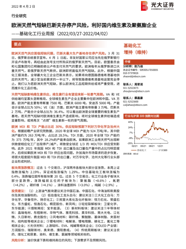 【光大证券】【20220402】基础化工行业周报:欧洲天然气短缺巴斯夫存停产风险,利好国内维生素及聚氨酯企业-25页