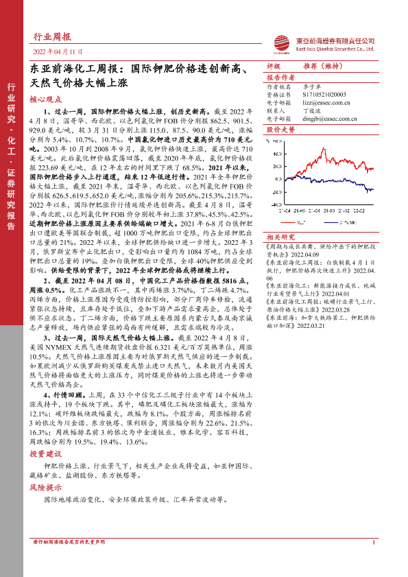【东亚前海证券】【20220411】东亚前海化工周报:国际钾肥价格连创新高、天然气价格大幅上涨-21页