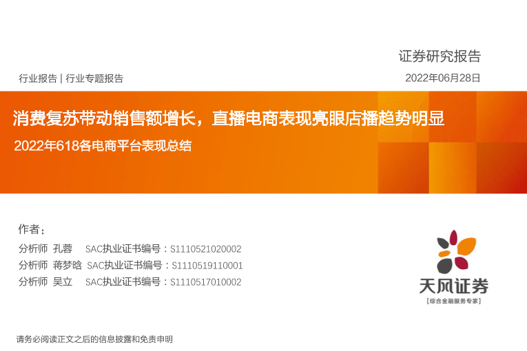 【天风证券】【20220628】电商行业:2022年618各电商平台表现总结,消费复苏带动销售额增长,直播电商表现亮眼店播趋势明显-29页