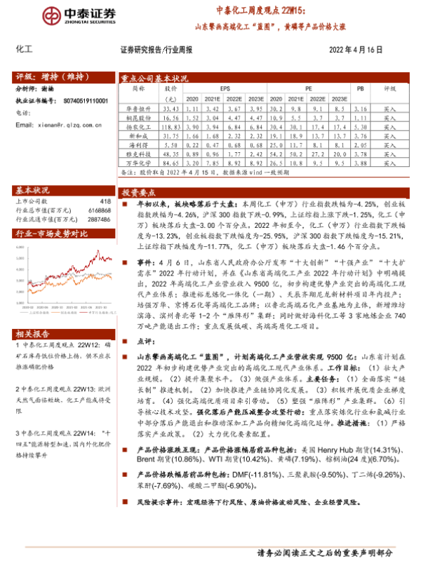 【中泰证券】【20220416】中泰化工周度观点22W15:山东擎画高端化工“蓝图”,黄磷等产品价格大涨-28页