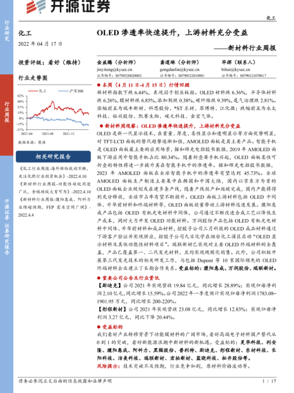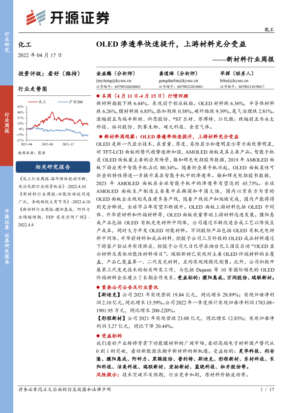 【开源证券】【20220417】新材料行业周报:OLED渗透率快速提升,上游材料充分受益-17页