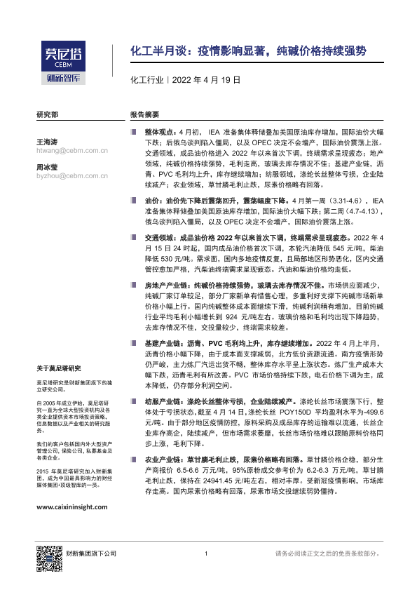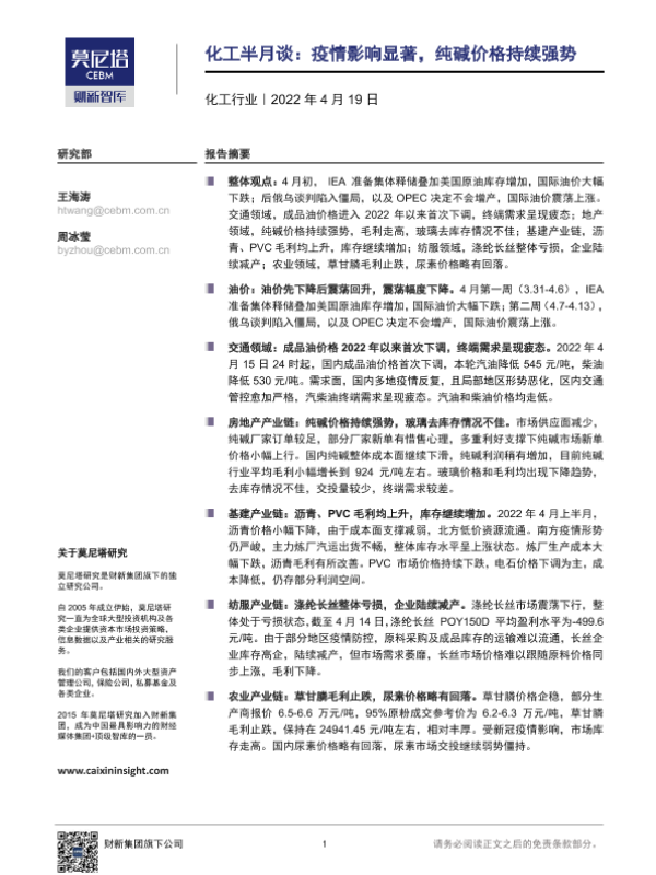 【莫尼塔研究】【20220419】化工半月谈:疫情影响显著,纯碱价格持续强势-9页