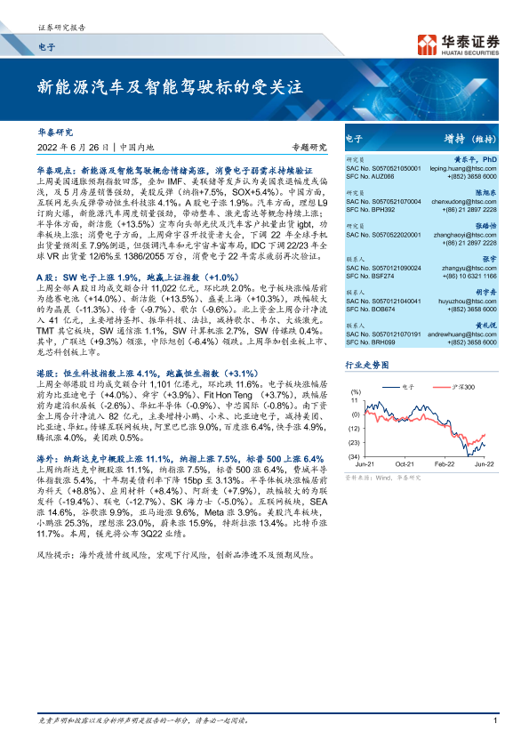 【华泰证券】【20220626】电子行业专题研究:新能源汽车及智能驾驶标的受关注-20页