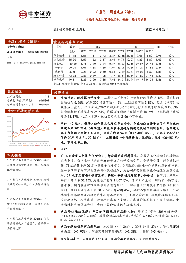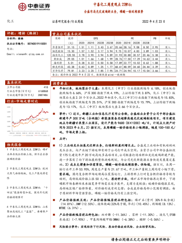 【中泰证券】【20220423】中泰化工周度观点22W16:合盛布局光伏玻璃新业务,磷酸一铵延续涨势-22页