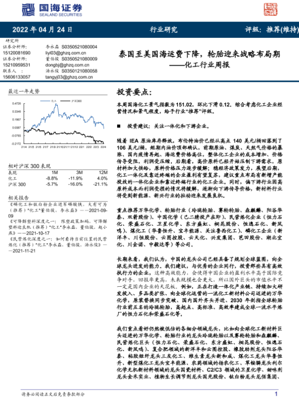【国海证券】【20220424】20220424-国海证券-化工行业周报:泰国至美国海运费下降,轮胎迎来战略布局期-52页