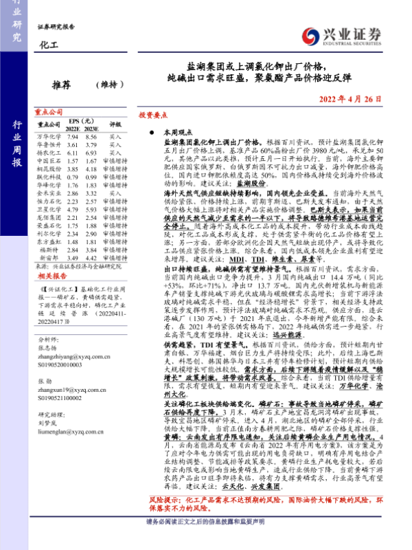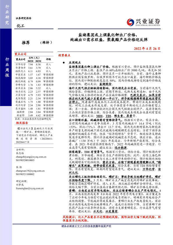【兴业证券】【20220426】20220426-兴业证券-化工行业周报:盐湖集团或上调氯化钾出厂价格,纯碱出口需求旺盛,聚氨酯产品价格迎反弹-49页