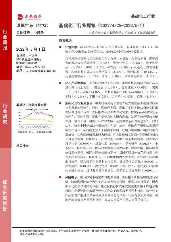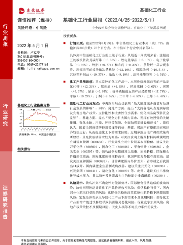 【东莞证券】【20220501】20220501-东莞证券-基础化工行业周报:中央政治局会议定调稳经济,有助化工下游需求回暖-11页