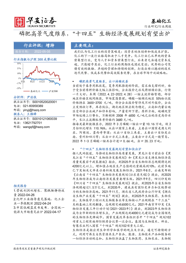 【华安证券】【20220505】基础化工行业周报:磷肥高景气度维系,“十四五”生物经济发展规划有望出炉-49页