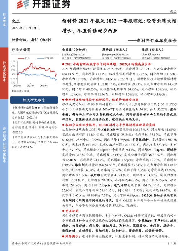 【开源证券】【20220509】新材料2021年报及2022一季报综述:经营业绩大幅增长,配置价值逐步凸显-31页