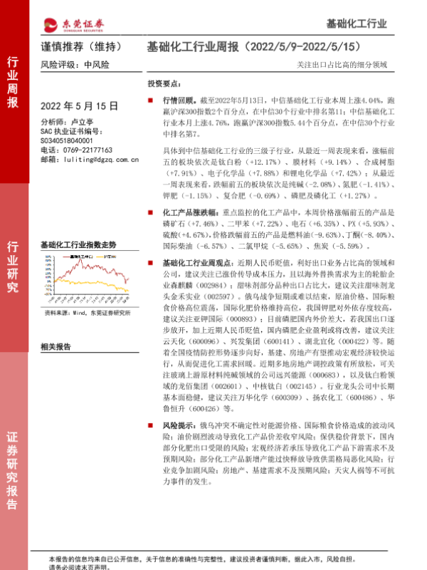 【东莞证券】【20220515】20220515-东莞证券-基础化工行业周报:关注出口占比高的细分领域-11页