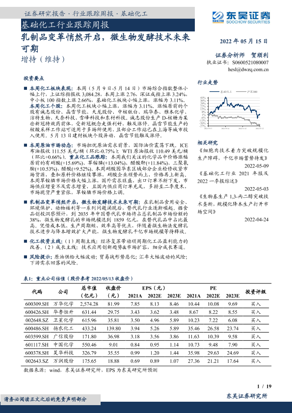 【东吴证券】【20220515】基础化工行业跟踪周报:乳制品变革悄然开启,微生物发酵技术未来可期-19页