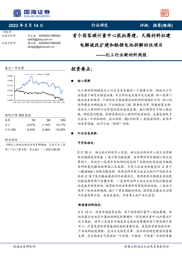 【国海证券】【20220514】20220514-国海证券-化工行业新材料周报:首个国家碳计量中心获批筹建,天赐材料拟建电解液改扩建和铁锂电池拆解回收项目-42页
