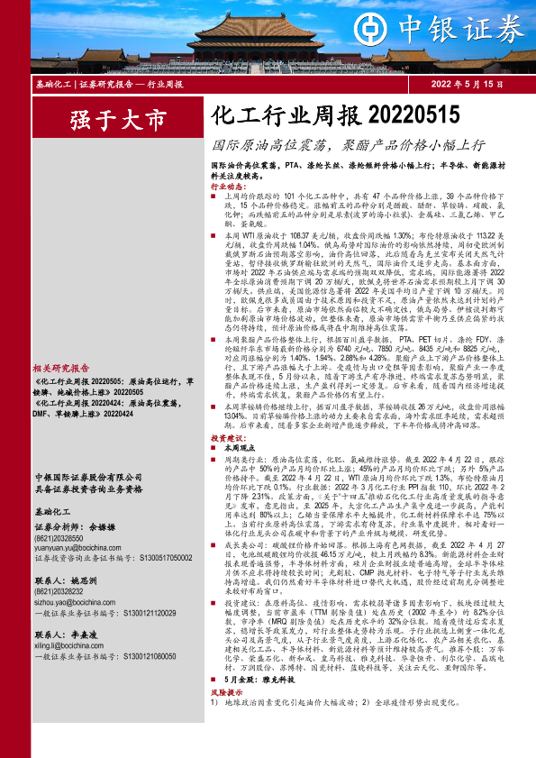 【中银证券】【20220515】20220515-中银证券-化工行业周报:国际原油高位震荡,聚酯产品价格小幅上行-15页