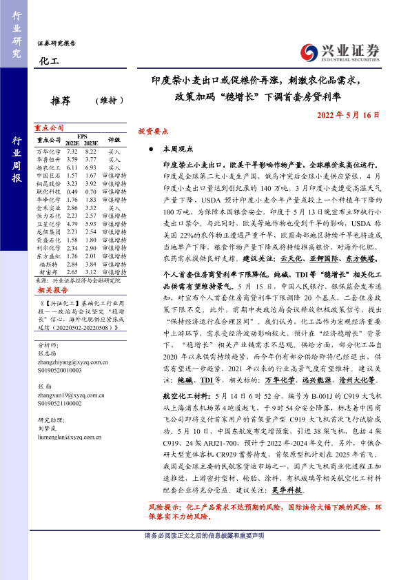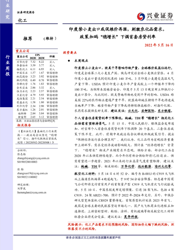 【兴业证券】【20220516】20220516-兴业证券-化工行业周报:印度禁小麦出口或促粮价再涨,刺激农化品需求,政策加码“稳增长”下调首套房贷利率-49页